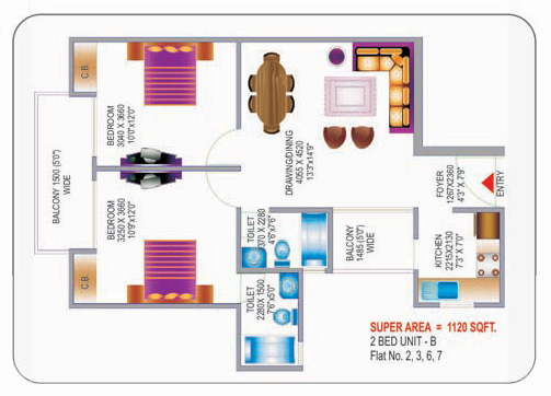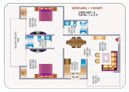 Area: 1120 sq.ft.2 bedrooms