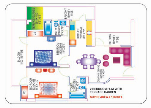 Area: 1280 sq.ft.2 bedrooms + Terrace Garden